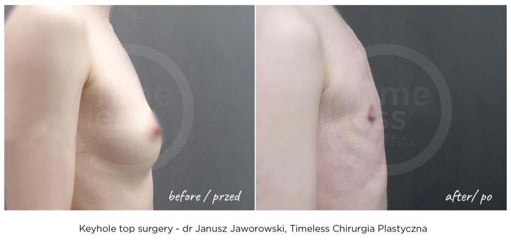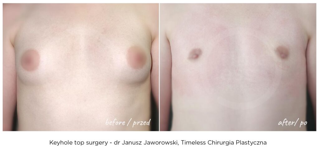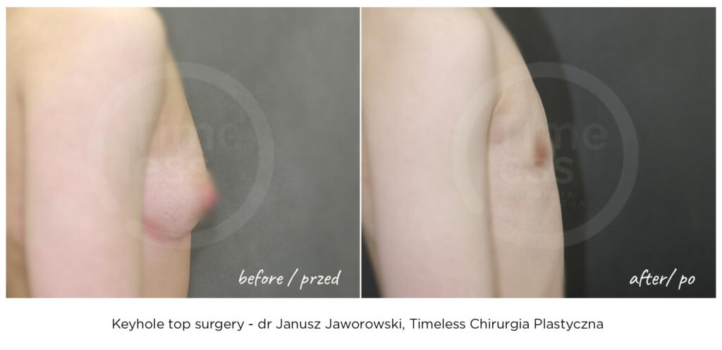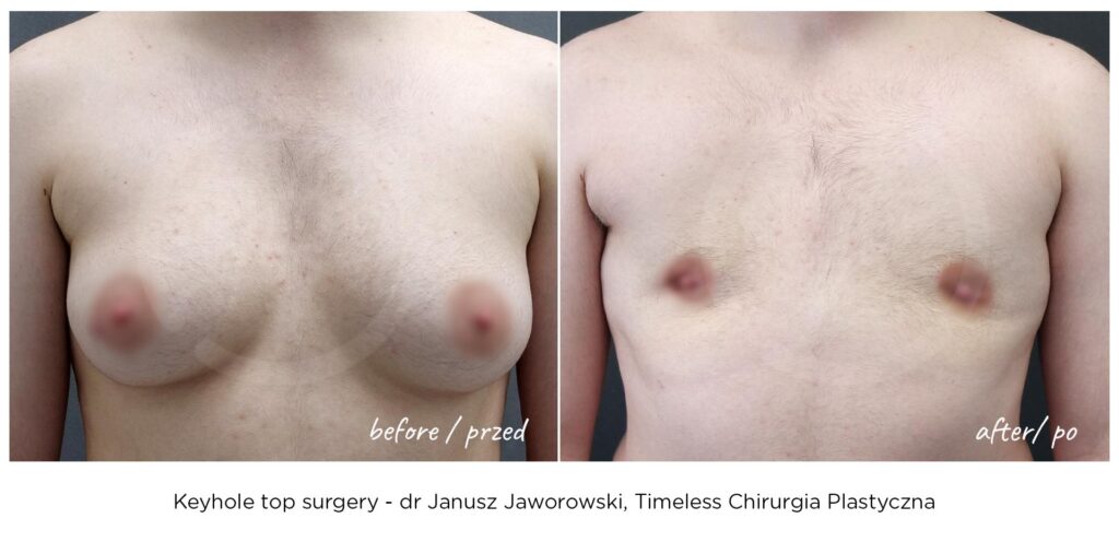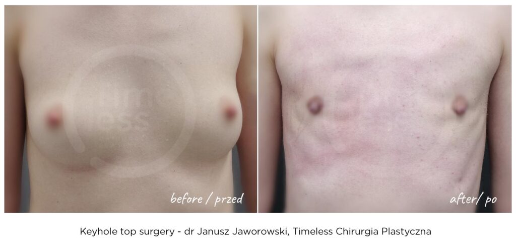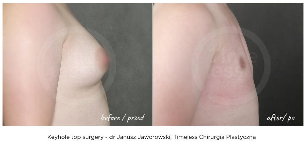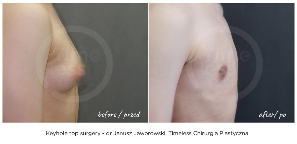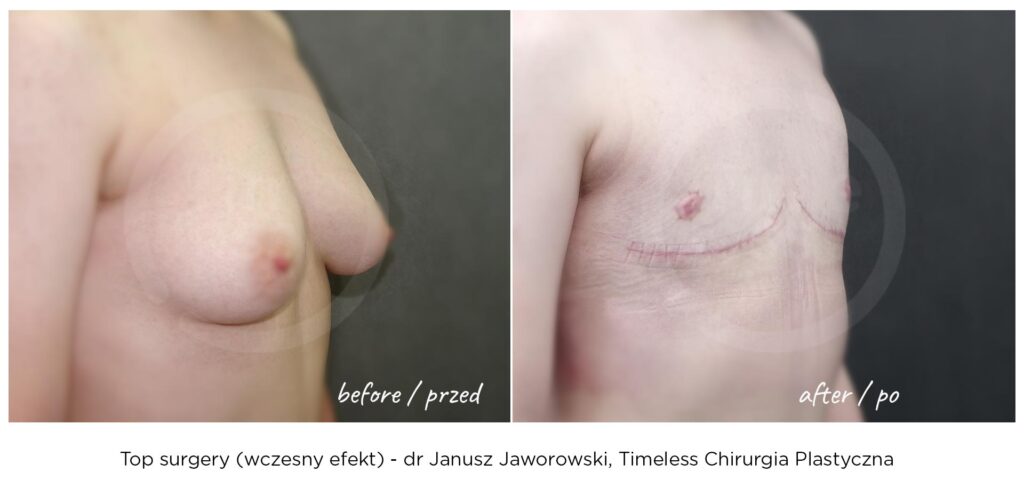 Rezultaty zabiegów top surgery (mastektomii), maskulinizacji twarzy, metoidioplastyki i innych wykonywanych w ramach tranzycji FTM, zależą w dużym stopniu od ustalonego planu leczenia, budowy ciała pacjenta oraz przebiegu rekonwalescencji. Nasza klinika – Timeless Chirurgia Plastyczna, jest zaufanym partnerem na drodze do osiągnięcia pożądanych rezultatów. Na zdjęciach prezentujemy rezultaty operacji przeprowadzonych w naszej klinice, jednak mają one wyłącznie charakter poglądowy i nie należy na ich podstawie oceniać możliwych efektów operacji we własnym przypadku.
